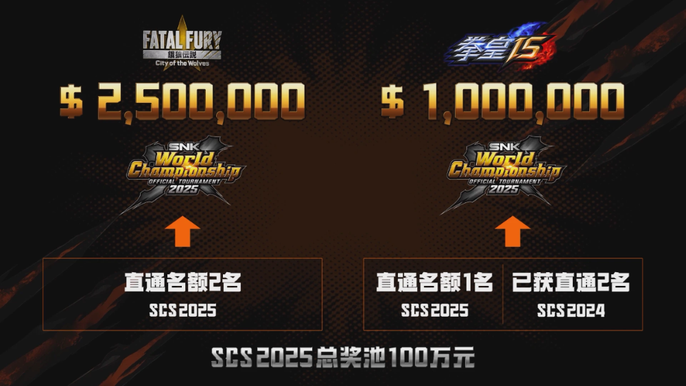 回顾首届SCS 2024,赛事以《拳皇15》为单一竞技项目,总奖金池为30万元。仅仅一年时间,奖金规模实现了超过三倍的增长,展现了SNK对中国格斗电竞市场的高度信心。