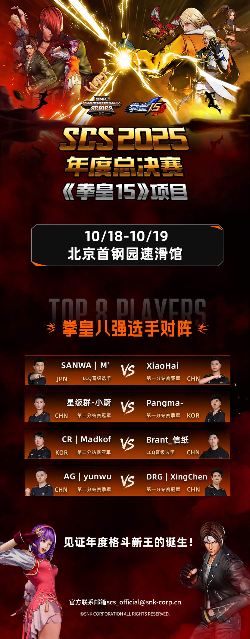 SCS 2025年度总决赛汇聚了全球顶尖格斗选手,阵容堪称豪华。在《拳皇15》项目中,小孩、Madkof(韩)、云雾、星辰、Pangma(韩) 等知名选手将展开激烈角逐。