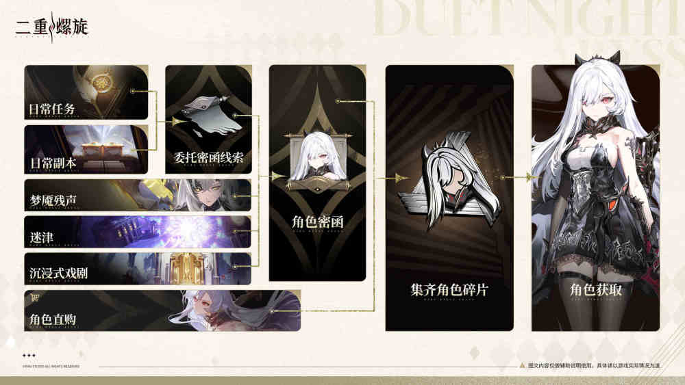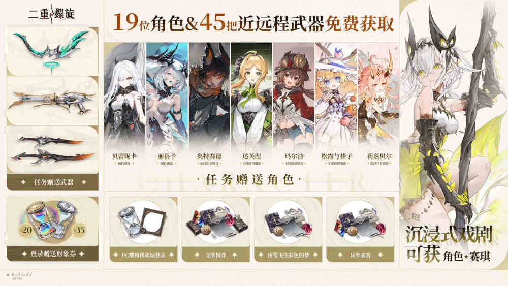 《二重螺旋》公测版本中,已开放4章主线剧情,以及实装包括自机角色在内的19位角色、45把近远程武器,角色与武器均可通过游戏内的委托密函系统免费获取,或在商店中直接购买。其中,包括贝蕾妮卡、丽蓓卡、松露与榛子在内七个角色还将通过任务流程、邮件赠送、活动在内的多种渠道进行赠送,极大程度确保玩家游戏前期的游玩体验与意愿。