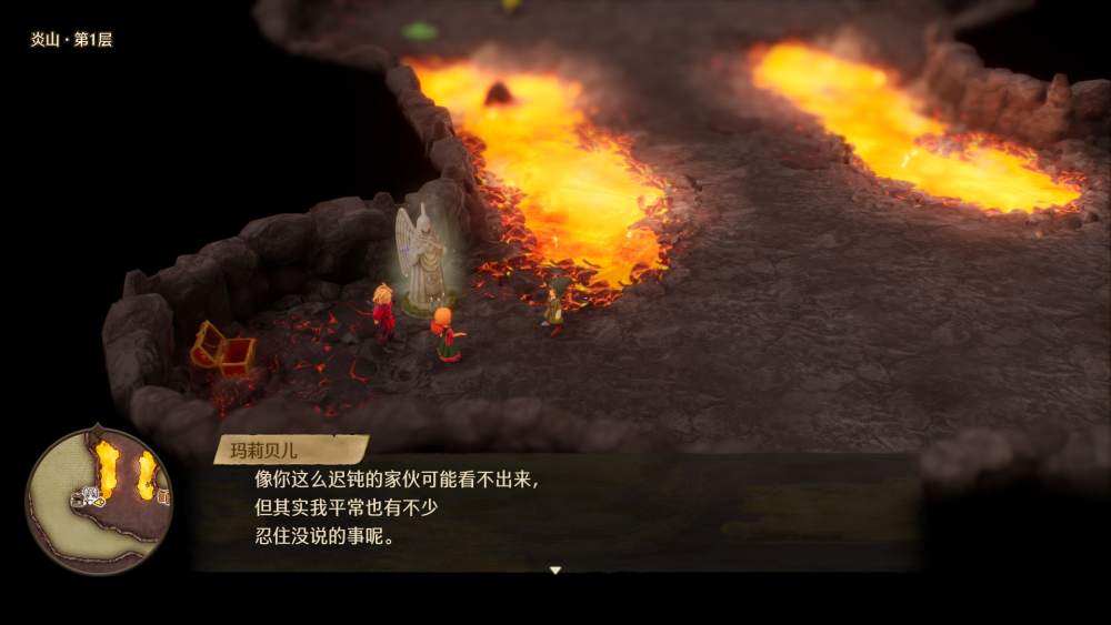 丰富的同伴对话也是原作就有的一大特色,在重制版中被忠实地保留了下来。同伴们会根据当前地进展为主角出谋划策,提示下一步的行动。也有很多体现角色性格的闲聊内容,比如经典的“蹭的累”角色——傲娇大小姐玛莉贝尔的对话就非常有趣。