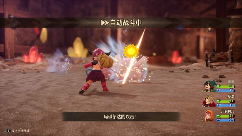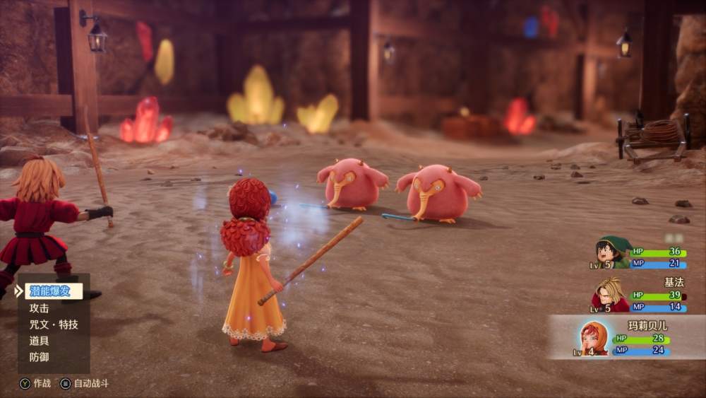 战斗部分有别于原版和3DS版,这次重制版角色们拥有动态更为丰富的战斗动画,观赏度大大提升。更加精致的怪物模型与动作,这也是本作一大看点。战斗时的UI更加简洁明了,在选择技能时会直接显示是否对敌人有效。此外,随着敌人血量下降,名字也会从白色逐渐变成黄色,到最后的红色,根据这一提示来部署下一步的战略。作为一款致力于解决回合制痛点的游戏,自然少不了战斗加速,自动战斗这些标配功能,在战斗时可以随时进行部署。同时还能设置队友们的作战指令,例如不使用MP,不使用潜能等,让队友不再“无脑”浪费资源,省时省心。