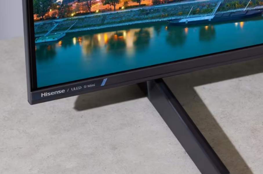 海信E7Q 标配脚架,T型直角硬塑脚架。此系列电视为送装一体,有固定挂件和安装服务,可选择壁挂安装。左侧有海信和蓝标ULED,Mini LED电视标识。右侧则印刷有帝瓦雷音响标识。