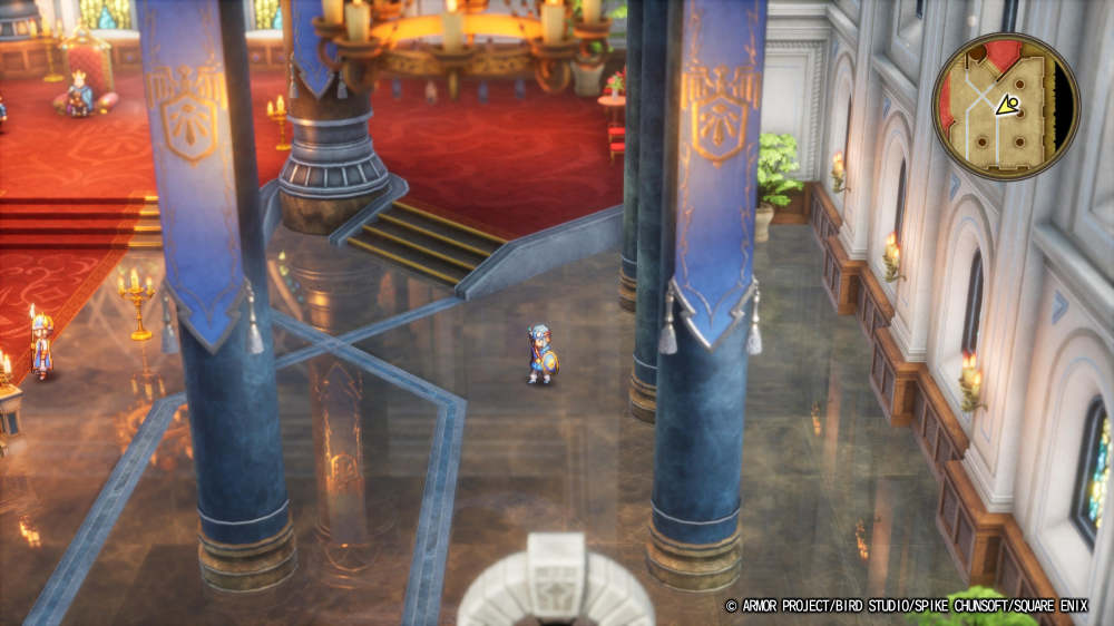 本次的DQ1&2重制版和DQ3重制版一样,没有滥用高对比度色彩与频繁的景深模糊效果,而是选择了更加贴近DQ系列风格的色彩表现,细腻圆润而有温度。随着角色与环境的相对关系的改变,地图场景、建筑、树木等环境元素的比例尺也相应扩大,同时还增加了大量的画面元素以使画面空间感不会空旷。比如空中弥漫的灰尘颗粒在直射的阳光下形成了丁达尔效应、在玩家经过时被惊动而飞走的鸽群、围着花草飞舞的蝴蝶……在推进剧情的间歇,驻足留意周遭的环境时,真的会被这些用心的细节而细腻的塑造所打动。此外值得一提的是,虽然本作是一款像素风游戏,但本作在贴图材质与光源表现上丝毫没有马虎。就比如DQ2一开始的萝蕾西亚城堡里,大理石地面反射的效果和边上绒布地毯的质感非常赏心悦目;在洞穴中提着火把前进时,手上的火光映照在潮湿的墙上时也让人感叹画面表现的细腻。