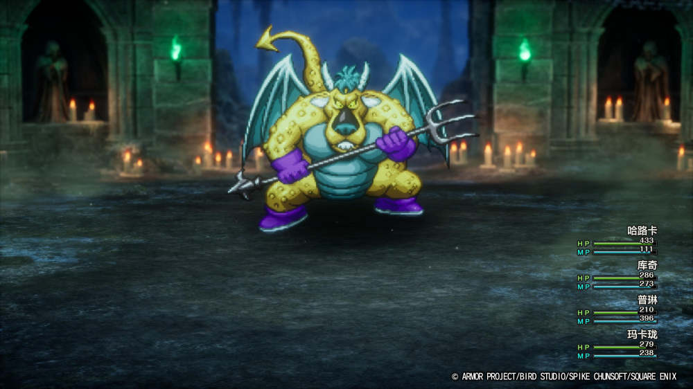 DQ的另一特色是由鸟山明设计的怪物,在本作中全部采用手绘像素图。在战历中的数字显示DQ1有116种怪物、DQ2有278种怪物,史莱姆、多拉奇这些经典的通用怪物虽然有一定重合,但整体来说怪物的种类是比较丰富的。而且怪物的动作帧数都非常足,大部分怪物都有四套动作、少部分BOSS级强敌会有五套动作,在被击败时甚至还配了特殊的战败音效,作为老DQ玩家来说能够从中感受到十足的诚意。只不过战斗部分仍然是主视角,如果实在不能接受的话看到这里可以自行避雷。