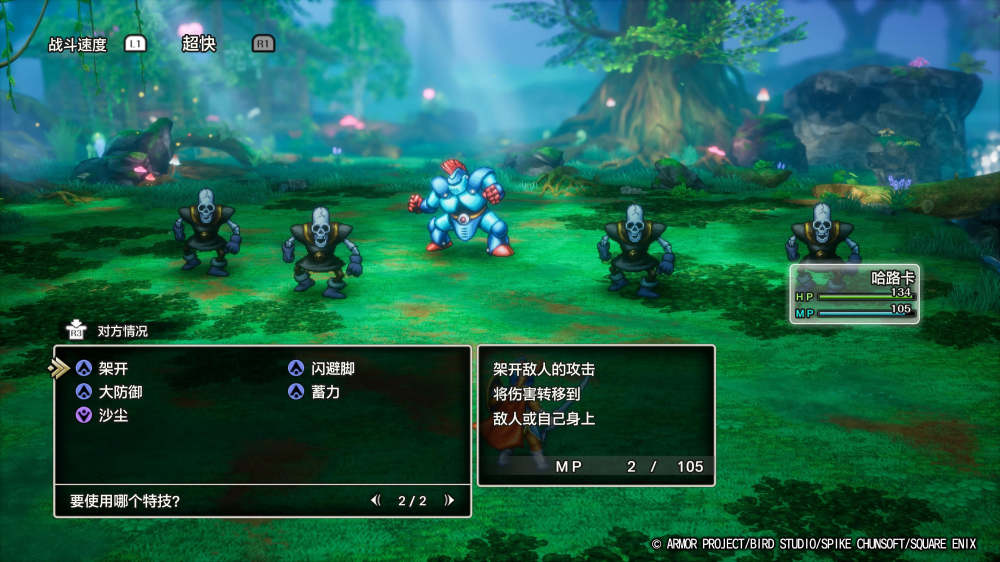 但单从战斗体验来说,虽然DQ2在增加了纹章与特技要素之后变得比原来有趣不少,DQ1的单人旅还是存在较大的局限。从故事上来说DQ1主角独自走上了挑战龙王的道路这一点是非常重要的要素,但单人的局限性与数值的失衡让DQ1部分的战斗体验并不是那么有趣。一对多的杂兵战尚且不算吃力,但进入BOSS战时则不得不兼顾回复与输出的平衡,甚至只是打个宝箱怪都不得不使用招架反击才能慢慢苟过去,实在有失勇者风范。到了DQ2之后让不同成员承担不同的职责时,总算能感觉到团队战斗的乐趣和战术的丰富。