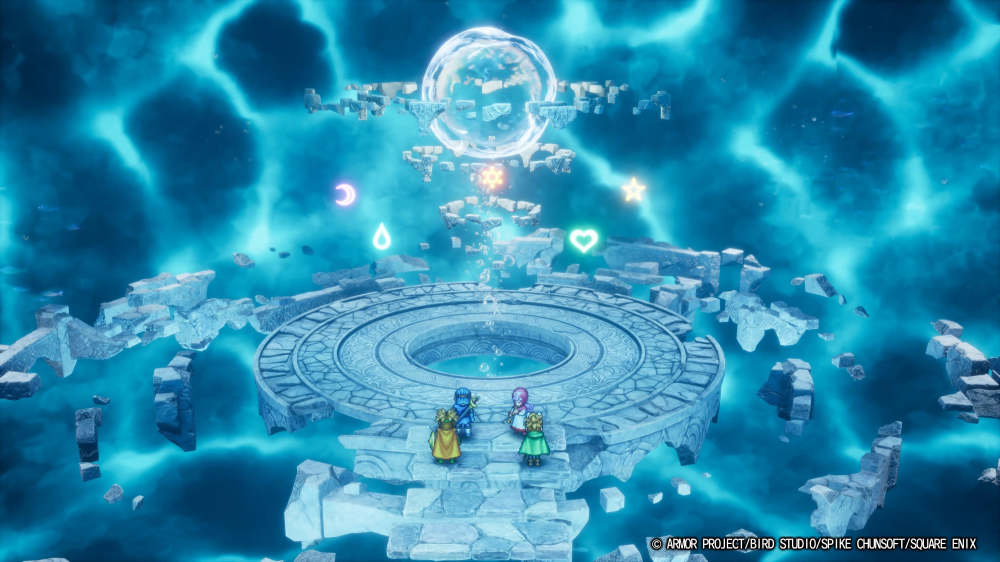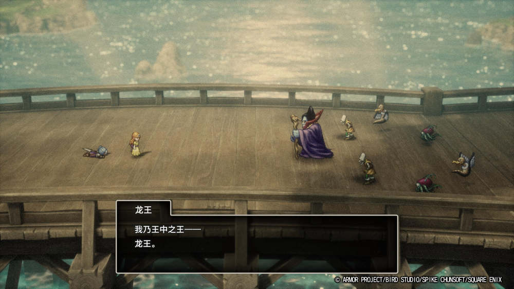 就比如开局时惨遭灭国的穆恩布鲁克,死里逃生的穆恩布鲁克王女走上的是向哈贡复仇的旅行、还是拯救世界的旅行,这一分歧就在于她作为洛特勇者之一、她应该做出的选择是什么;又比如玩家所扮演的萝蕾西亚王子,就和其他DQ主角一样没有台词,但在本作的故事中也讲述了其作为洛特血统的继承人却完全无法使用咒文、但同时又不得不肩负起巨大的重担的那种沉重宿命。在本次的重制版中,就对这一部分进行了相当细致的刻画。而作为加强演出的一部分,在剧情中角色并不只是站桩对话,还增加了许多动作以强化演出观赏性。虽然是像素风角色但一举一动都非常细腻,在一些场景甚至还做了从眼眶中流出的泪水。