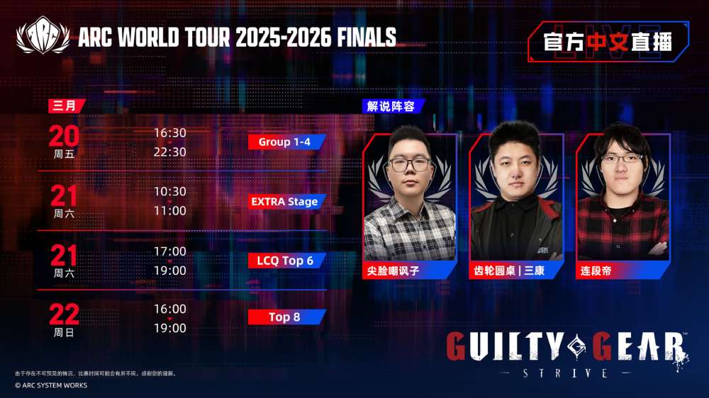 《Guilty Gear -Strive-》解说阵容:@尖脸嘲讽子、齿轮圆桌-三康、连段帝