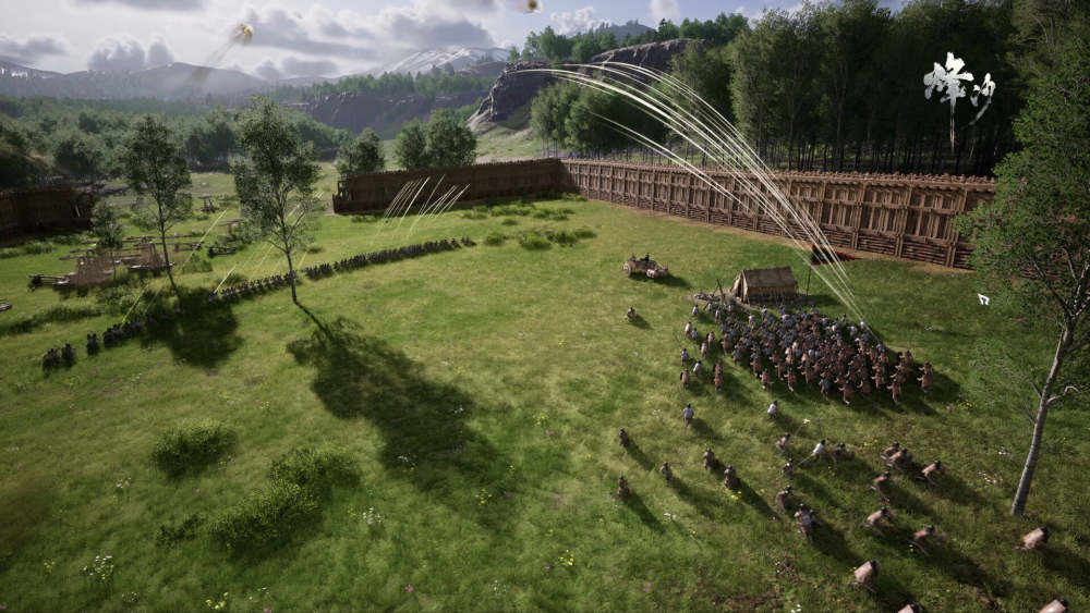 除了采集、种田、建造、物流之外,战斗也是游戏中重要的一环。战车是春秋战国最具代表性的战争符号,在《烽沙》中,战车拥有极强的冲锋破阵能力,利用物理引擎的特性,战车可以直接将敌方步兵撞开,带来极强的视觉冲击力和战术压制力。在城防战中,玩家可以自由规划城墙走向,在墙头布置滚油、投石车等器械,结合阵型规划,上演史诗级攻防战。