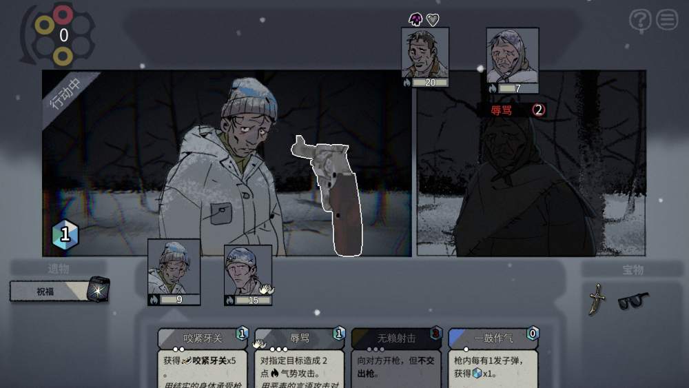 每场战斗开始时,玩家都要通过和敌人交替装填子弹,来决定子弹的排序和开枪优先权。向自己射击可以继续回合,朝敌人开枪则会结束回合,将主动权交给对方……如此推进,直到枪中的实弹都被射出。