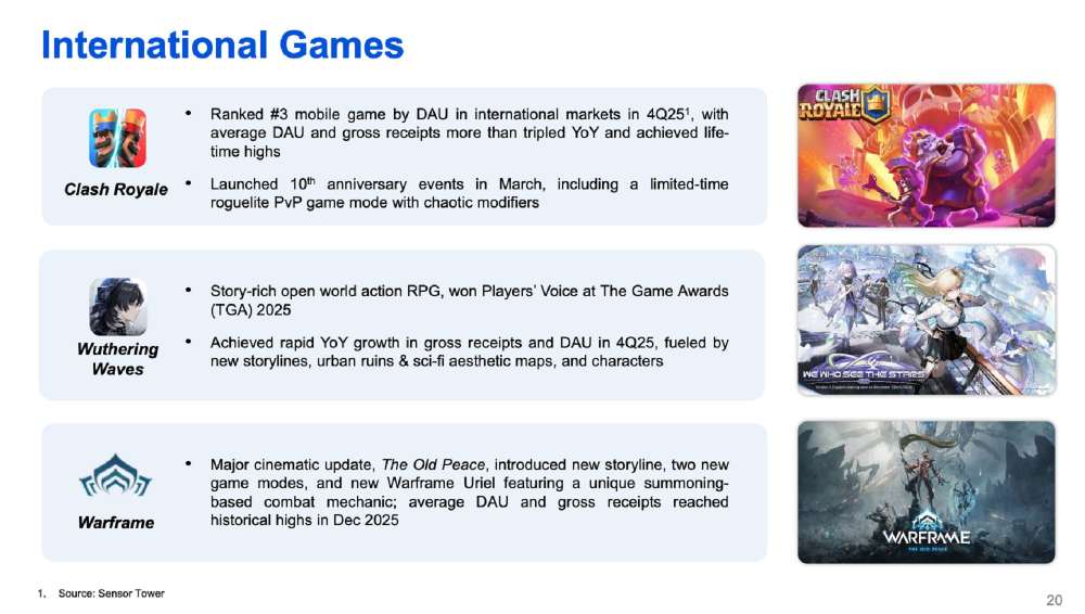 腾讯控股(00700.HK)公布2025年全年业绩。财报显示,公司全年实现营收7518亿元,同比增长14%;受益于长青游戏的持续增长及内容驱动游戏的快速扩张,国际市场游戏收入突破100亿美元,同比增长33%(按固定汇率计算为32%),创造历史新高。在随后举行的业绩分析师电话会议上,腾讯公司管理层就国际市场游戏表现作出正面评述,Digital Extremes旗下的《Warframe》被作为案例重点提及。