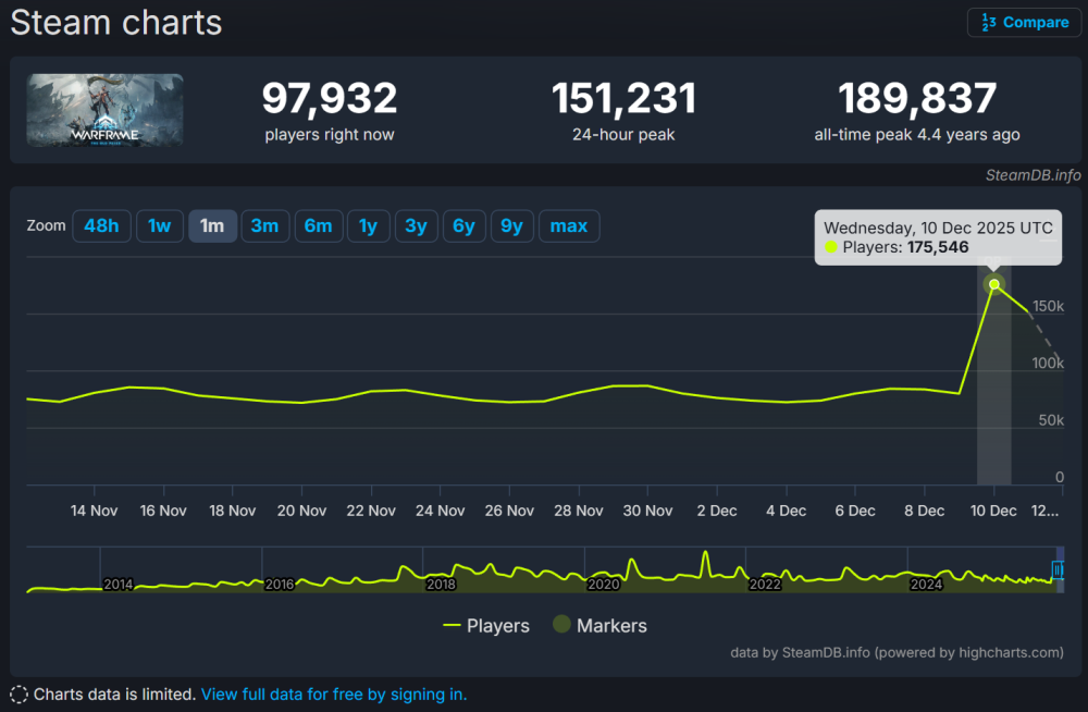 去年12月11日,包含电影级主线故事的全新序幕、全新游戏模式、新战甲外观等多项重磅内容《Warframe》年度版本“旧日和平”在全球同步上线。版本上线当天,这款已运营12年的游戏在Steam全球及国区销量榜均跻身第二位,当日实时在线峰值人数达17.5万,实现自2021年7月以来最高同时在线玩家人数,为游戏近年最高单日峰值。