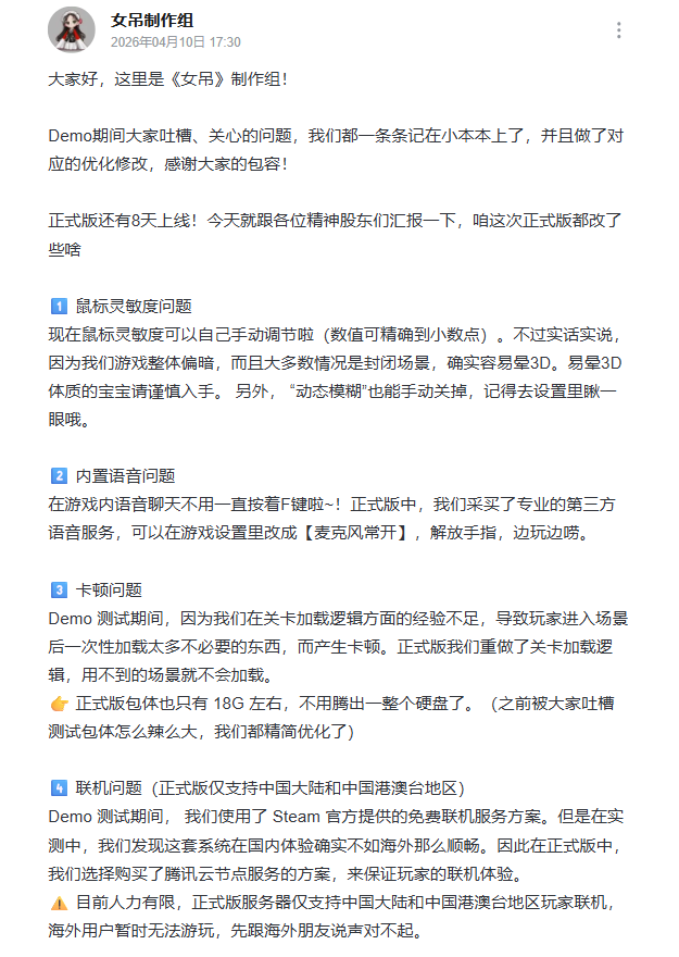 近期《女吊》官方也公布了正式版的优化内容。正式版迭代了整套联机方案以及关卡加载逻辑。Demo被玩家吐槽的联机和卡顿问题,基本得到解决。不过因为制作组人手和资金有限,目前只部署了国内(包含港澳台地区)的服务器,海外玩家暂时无法游玩。